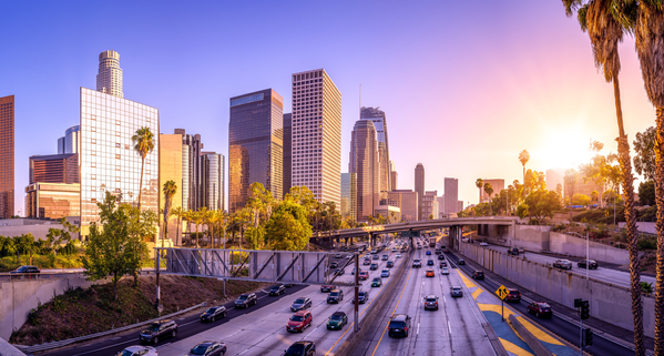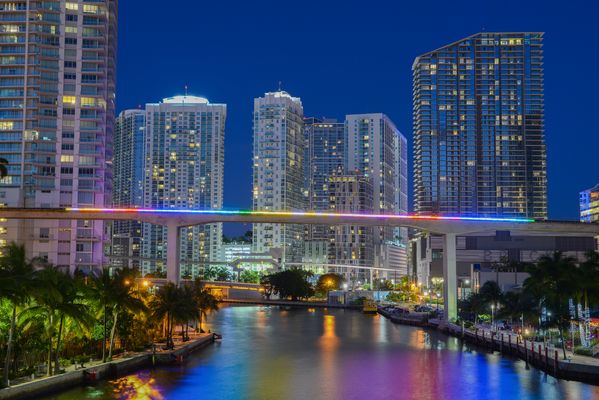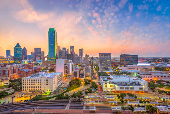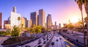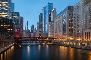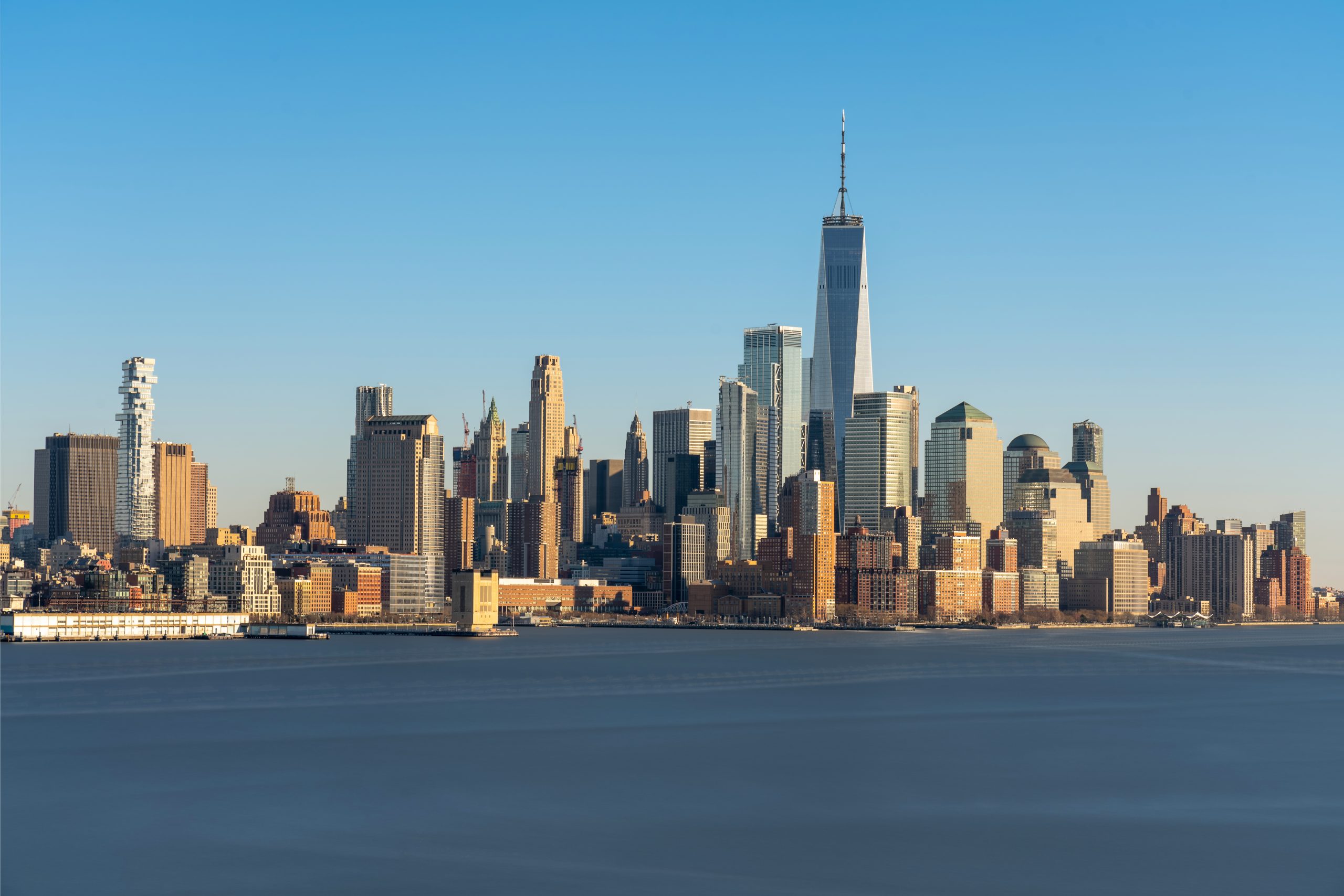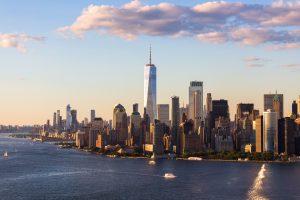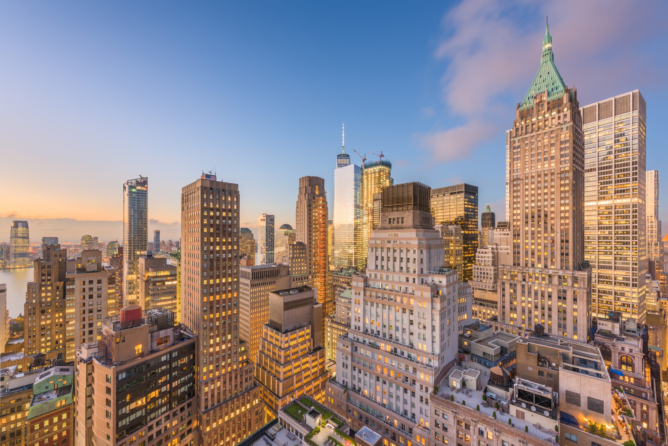 New York City Financial District cityscape at dusk.