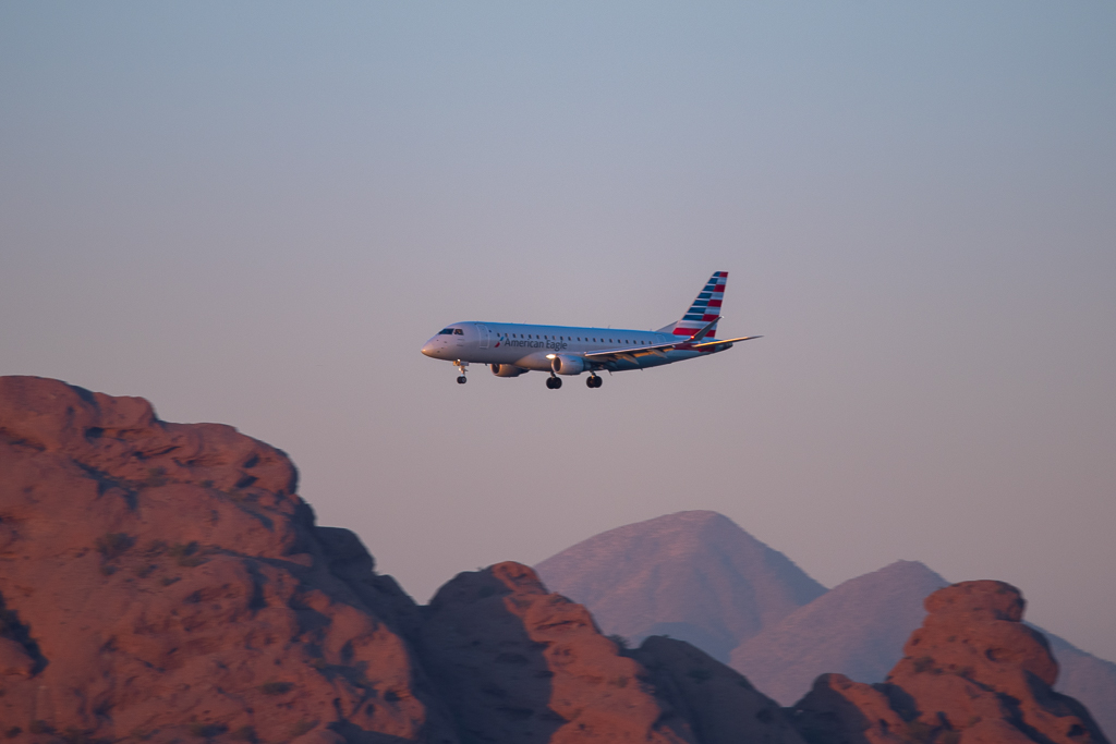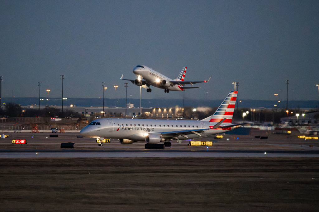 N268NN parked at gate (E175) w/ mainline 737 taking off in background